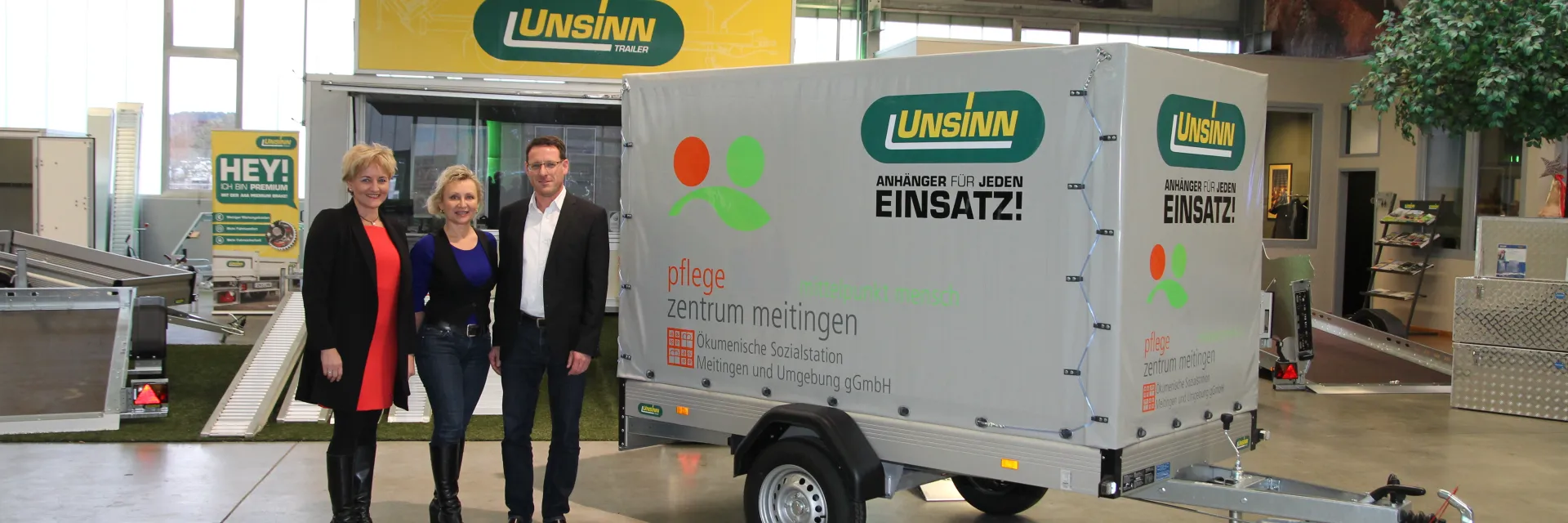 Holzheim - Die Firma UNSINN aus Holzheim spendet 1200 Euro an die DKMS und einen Anhänger mit Plane an die Sozialstation in Meitingen. Getreu dem Motto „Spenden statt Schenken“, verzichtet die Firma auf Geschenke für Geschäftskunden und unterstützt soziale Projekte. So kann sich dieses Jahr die Sozialstation in Meitingen über einen neuen Anhänger freuen. „Das erleichtert meinen Mitarbeitern wirklich die Arbeit, wenn z. B. die Spenden für die Tafeln unkompliziert von A nach B transportiert werden können“, schwärmt der Geschäftsführer Jürgen-M. Werner über seinen neuen Anhänger.
