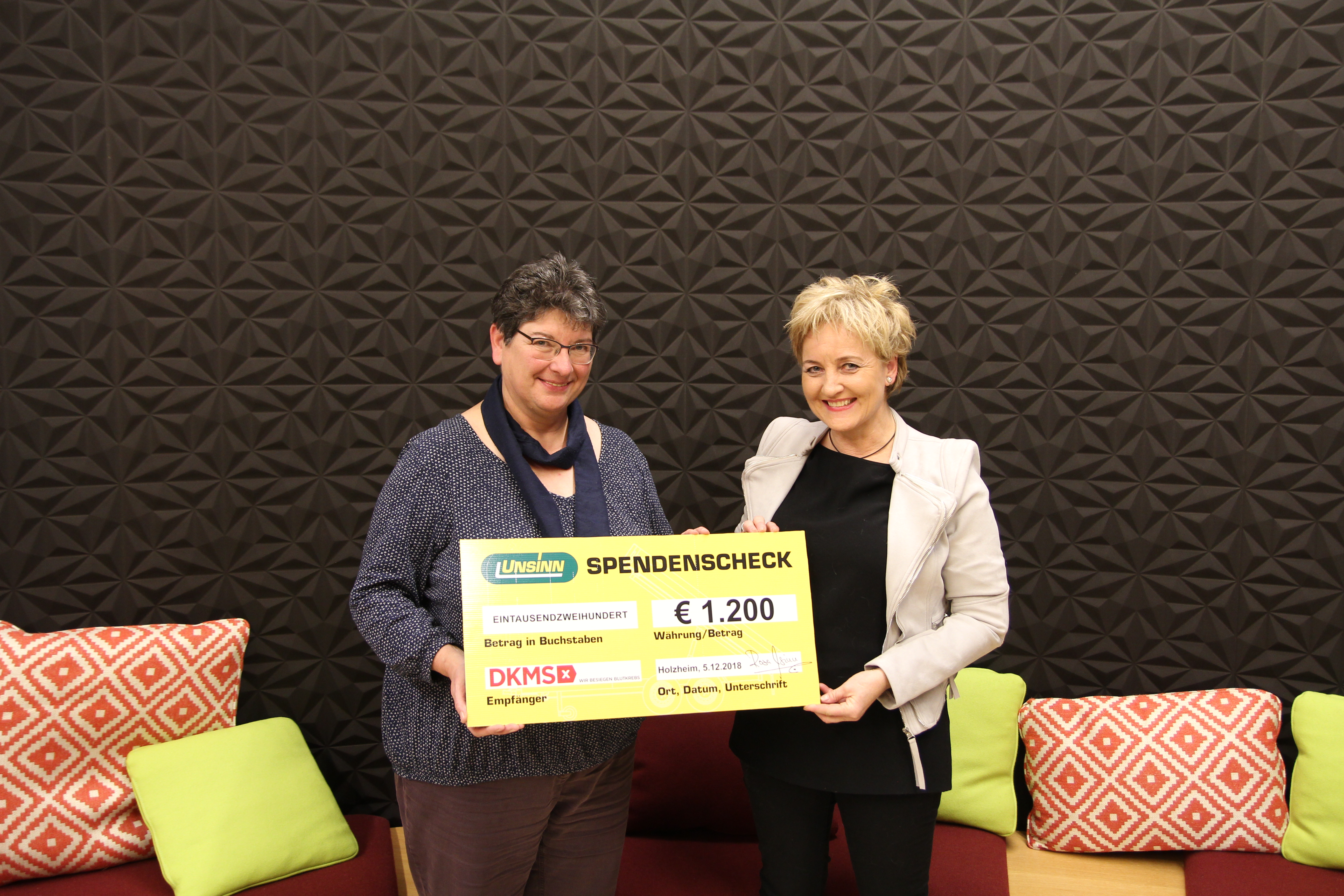 Über eine Geldspende von 1200 Euro kann sich die DKMS freuen, die das Geld vor allem für die Typisierungen (35 Euro pro Test) gut gebrauchen kann. Mit einem einfachen Speicheltest wird man in die Spenderdatenbank aufgenommen und kann so Menschenleben retten. „Viele kleine Leute an vielen kleinen Orten, die viele kleine Schritte tun, können das Gesicht der Welt verändern.“, so beschreibt Brigitte Lehenberger ihre ehrenamtliche Arbeit bei der DKMS. Durch regelmäßige öffentliche Typisierungsveranstaltungen z. B an Schulen oder Firmen, sollen potentielle Spender informiert und zur Teilnahme angeregt werden. Die Firma Unsinn plant solch eine Veranstaltung für 2019. „Bei der letzten Aktion 2008 bei uns im Haus, konnten viele neue Spender in die Datenbank aufgenommen werden“, so Geschäftsführerin Rosa Unsinn.