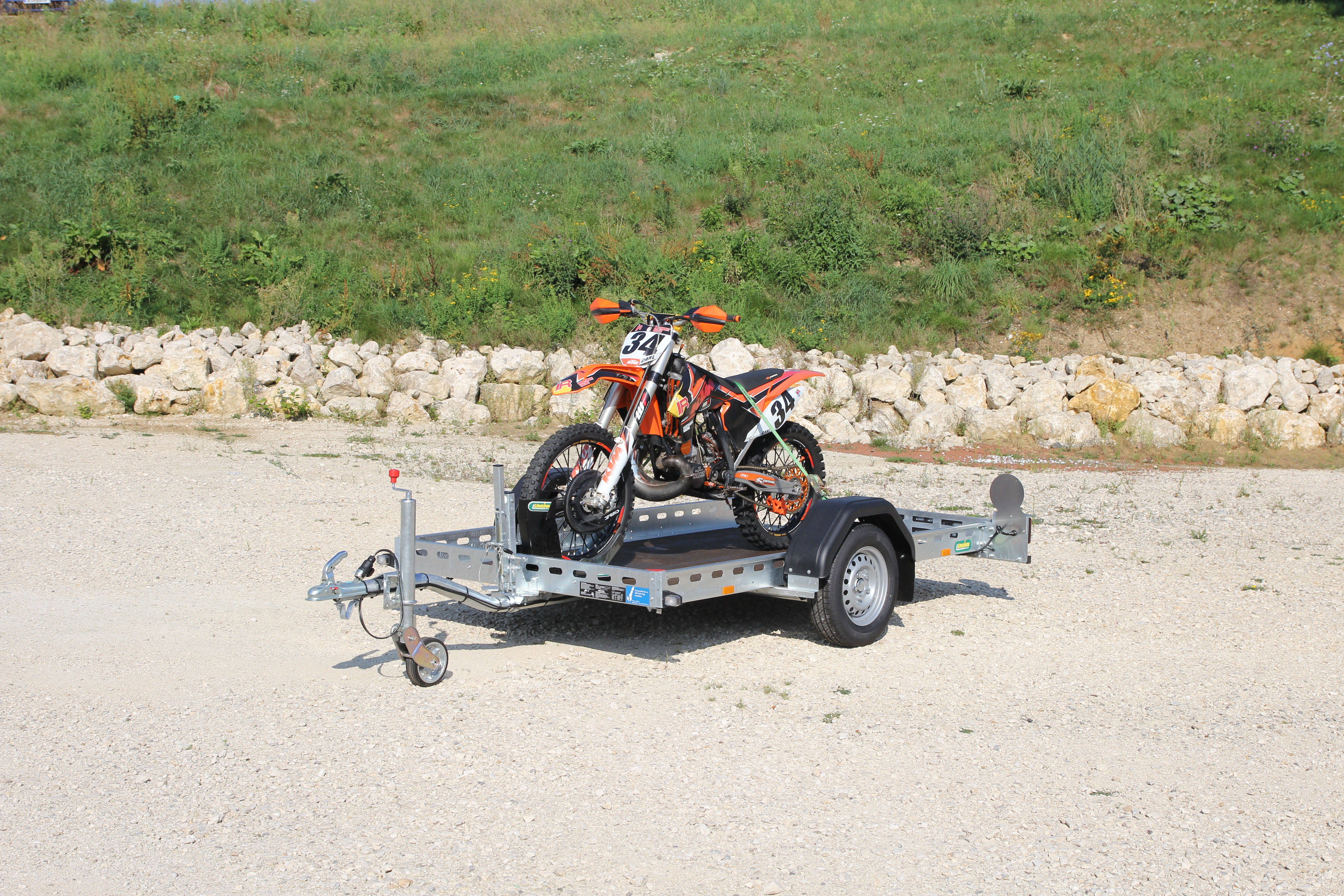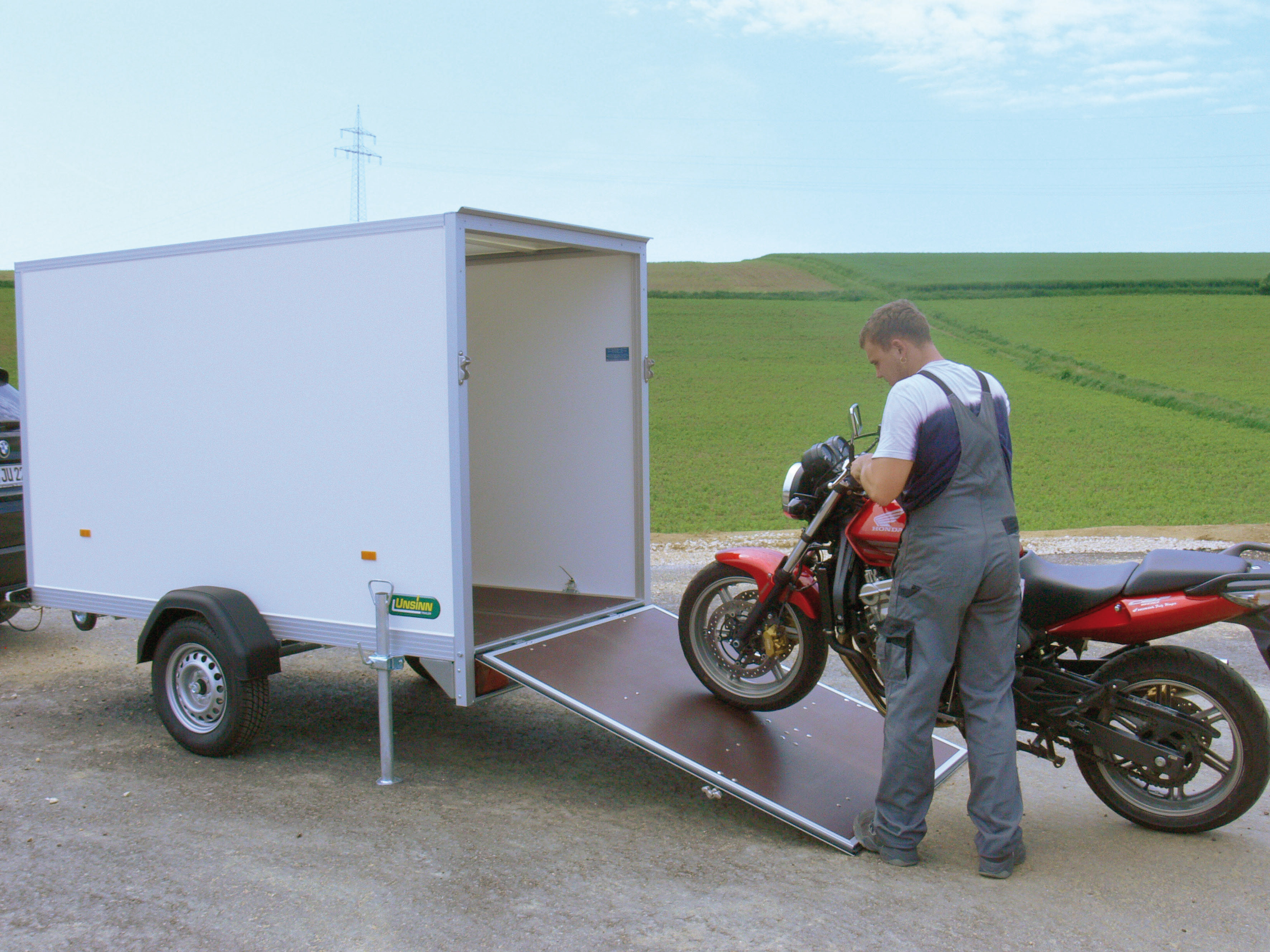 Wer auf Reisen gerne das Motorrad oder den Roller mitnimmt, tut sich mit einem Absenkanhänger besonders leicht. Durch den geringen Auffahrwinkel ist das Zweirad binnen kurzer Zeit aufgeladen, eine Motorradwippe gewährleistet einen stabilen Stand. Gurte können am Außenrahmen sowie am Zurring auf der rutschhemmenden Ladefläche befestigt werden. Auf Wunsch ist der Absenkanhänger auch mit Bordwänden, einem stabilen Kofferaufbau oder einer Hochplane mit aufklappbarem Planendach erhältlich. Damit ist das Bike ideal vor Wind und Wetter geschützt.