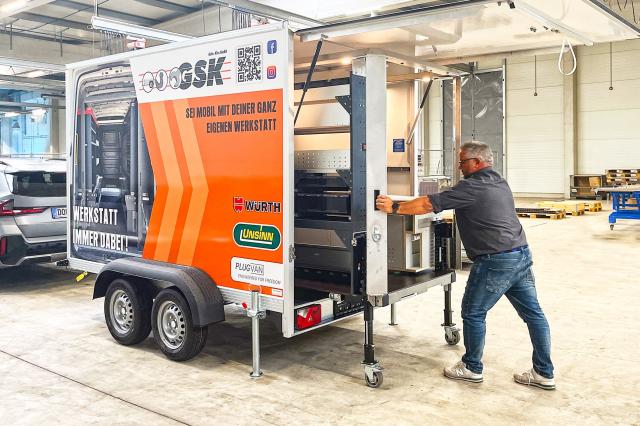 Bühne frei für die flexible, individuell konfigurierbare Werkstatt im PKW-Anhänger – eine Kooperation der GSK Gebrüder Klos GmbH, PlugVan und UNSINN Fahrzeugtechnik.