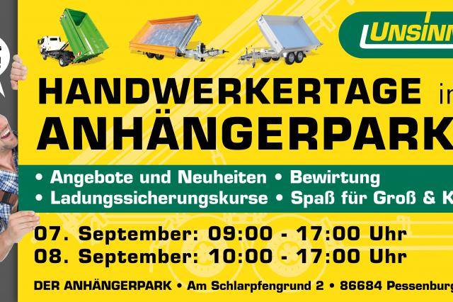 Am Samstag, 07. und Sonntag, 08. September 2019 öffnet die Firma UNSINN im Anhängerpark in Pessenburgheim ihre Türen für alle Profi- und Hobbyhandwerker. Bei den Handwerkertagen können sich die Besucher von den praktischen Transportlösungen und vielen Produktneuheiten an Ort und Stelle überzeugen.