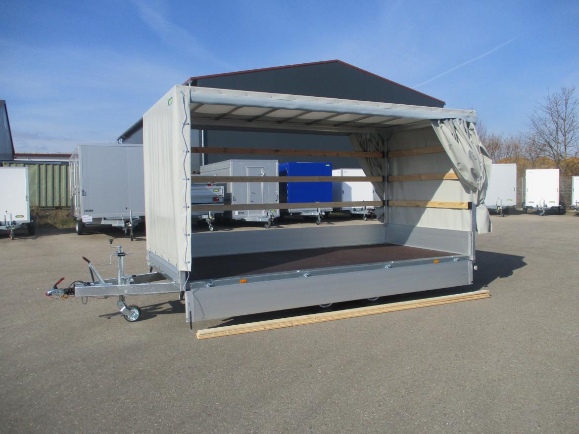 2,6 to Pritschenhochlader mit Niedrigbereifung auf 10“-Alufelgen mit Planenaufbau LH 2000 mm und Schiebeplane links und rechts, hellgrau Gesamtgewicht 2.600 kg Aufbaumaße innen 4.260 × 2.040 × 2.000 mm zum Anhänger