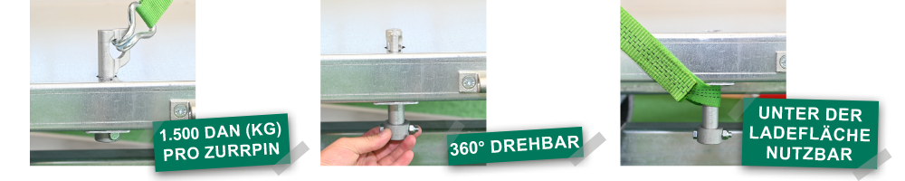 Die Zurrpins können sowohl auf als auch unter der Ladefläche, z. B. mit einer Gurtschlaufe, mit jeweils bis zu 1.500 daN (kg) belastet werden. Auf jeder Längsseite sind bis zu neun Zurrpins verbaut, wodurch der Kipper selbst für schwere Lasten wie Baumaschinen, Paletten und Co. optimal gerüstet ist. Jetzt Dreiseitenkipper mit Spinlock entdecken