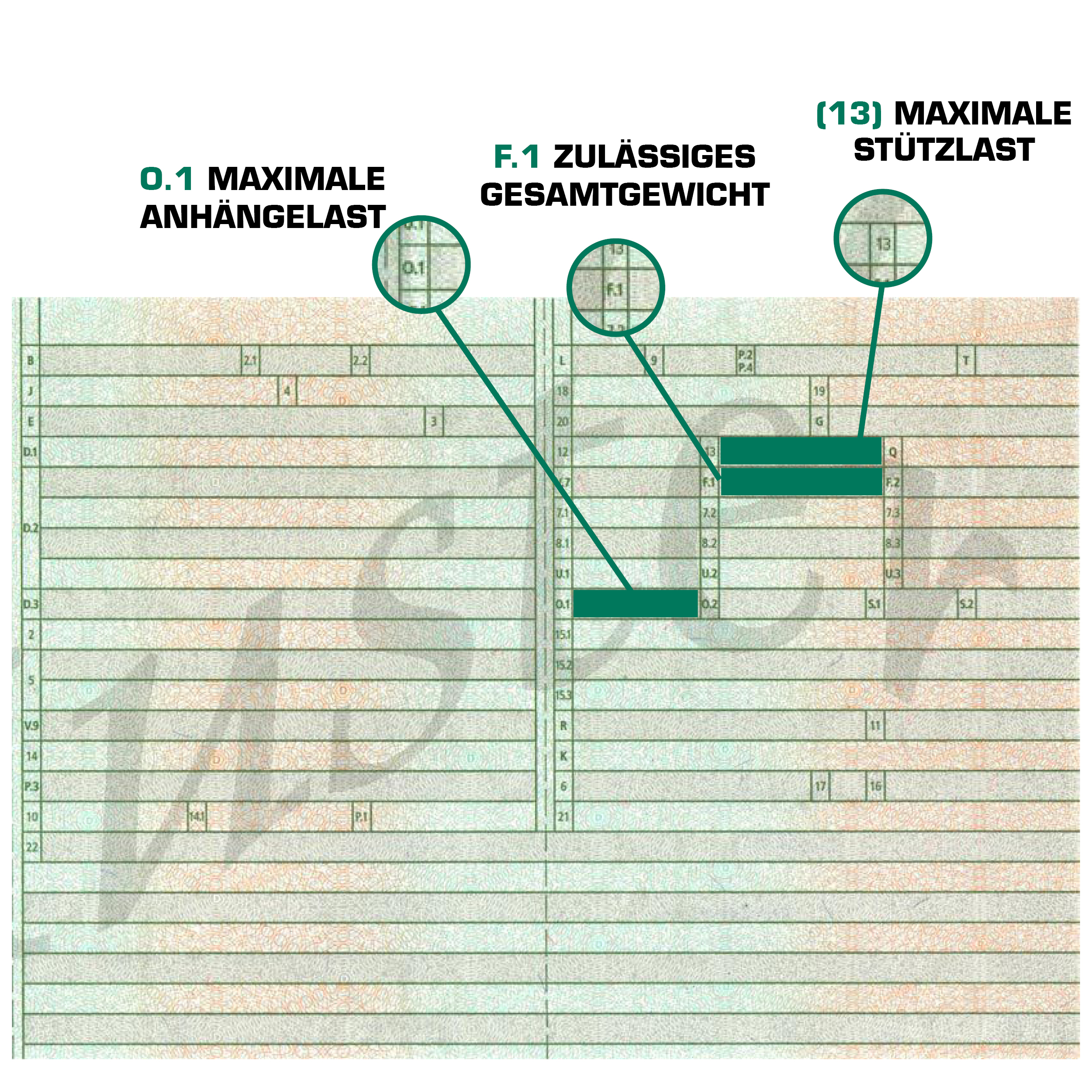 Um herauszufinden, ob die Anhängelast überschritten ist oder nicht, entnehmen Sie die Angaben zur Anhängelast der Zulassungsbescheinigung Teil 1 unter Nr. O.1 (ungebremst) und Nr. O.2 (gebremst). Wenn Sie einen älteren Fahrzeugschein haben, finden Sie die Anhängelast unter Nr. 28 / Nr. 29.