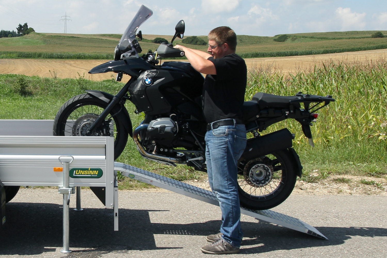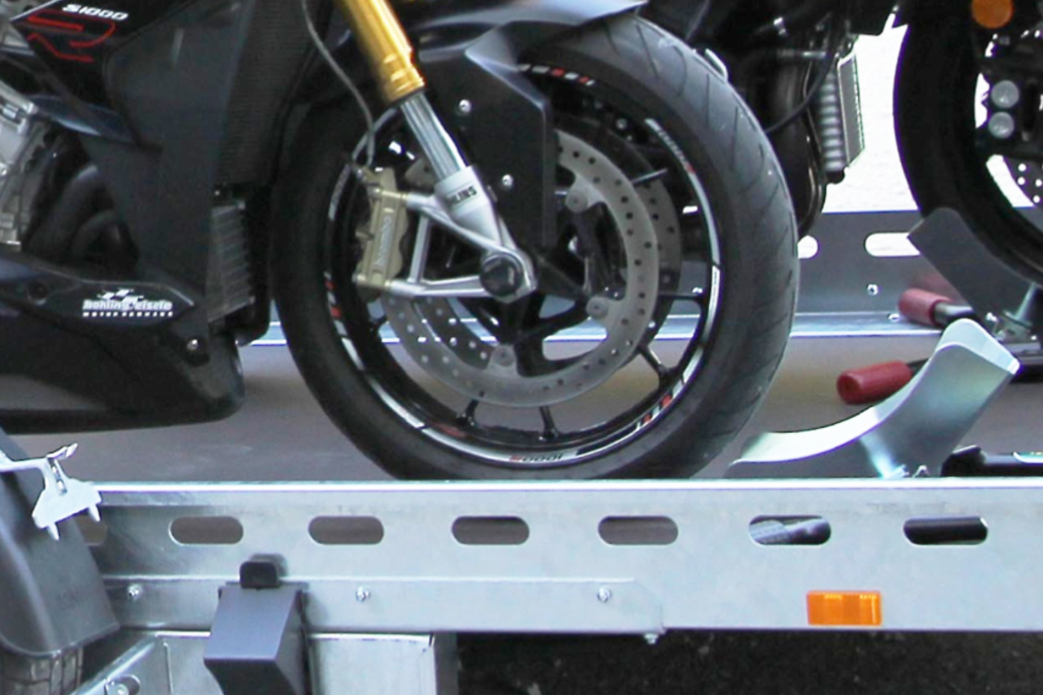 Eine Motorradwippe bzw. ein Vorderradständer erleichtern das Verladen auf dem Anhänger, da sie das Vorderrad des Motorrads ohne weitere Hilfsmittel senkrecht halten. Wichtig ist, dass der Ständer möglichst weit vorne angebracht wird und die Breite zum Reifen des Motorrads passt. Eine andere Möglichkeit sind Standschienen. Diese unterstützen zusätzlich den Hinterreifen und sorgen für einen stabilen Stand.