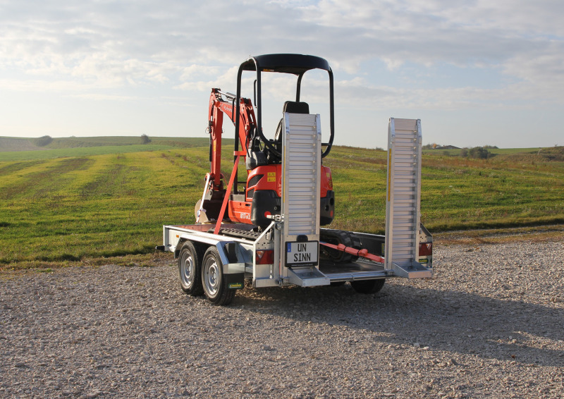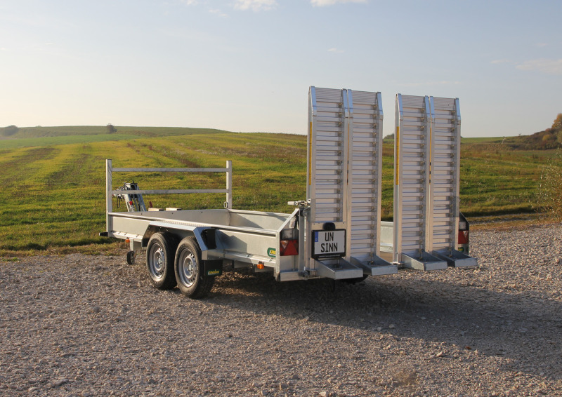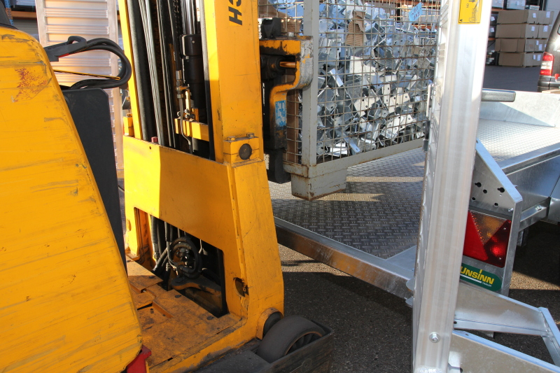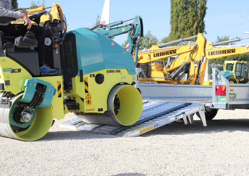 • 2 abklappbare, seitenverstellbare und seitlich wegschwenkbare Auffahrschienen aus Aluminium mit integrierter Bodenabstützung und einer Tragkraft von 3500 kg/Paar
