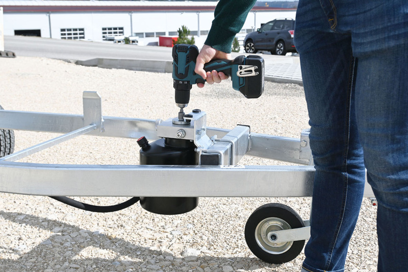 • Verstärktes, an einer separaten Quertraverse montiertes Automatikstützrad mit einer Tragkraft von 500 kg für sicheres Abstellen des Anhängers