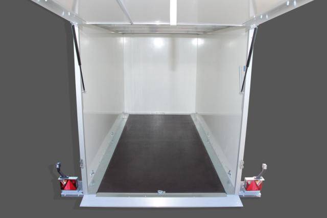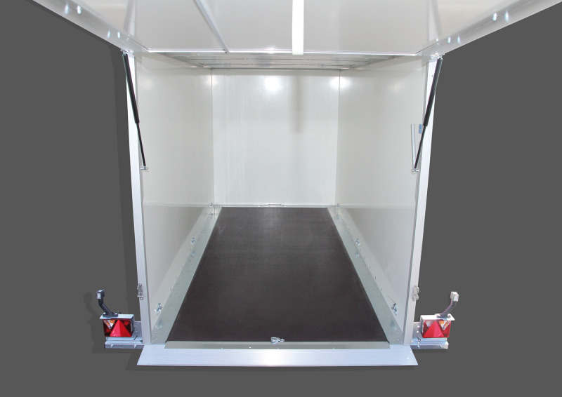 Nach oben öffnende Heckklappe mit Edelstahl-Drehstangen- verschluss und nach unten klappende Überfahrrampe, Durchgangsmaß B x H 1690 x 1830 mm