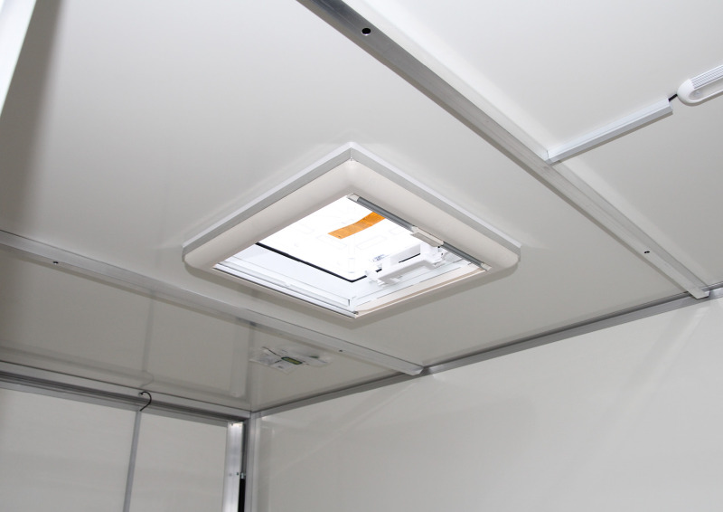 • Ausstellhaube ca. 500 x 500 mm, mit Moskitonetz und Verdunkelungsrollo mittig im Dach montiert