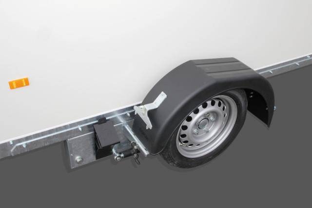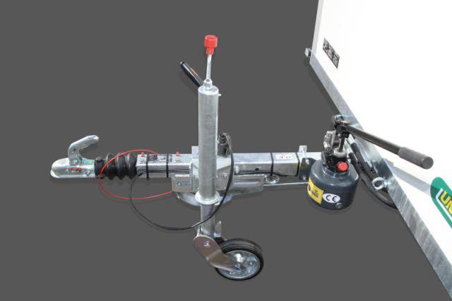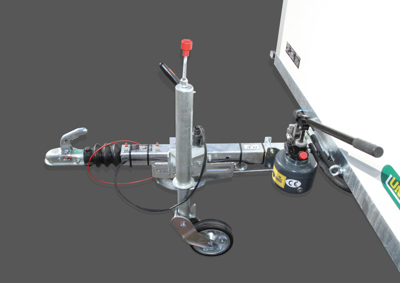 • Verstärktes, an einer separaten Quertraverse montiertes Automatikstützrad mit einer Tragkraft von 500 kg für sicheres Abstellen des Anhängers