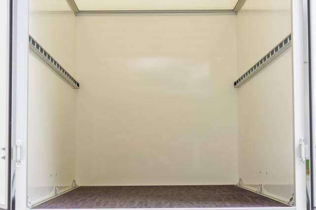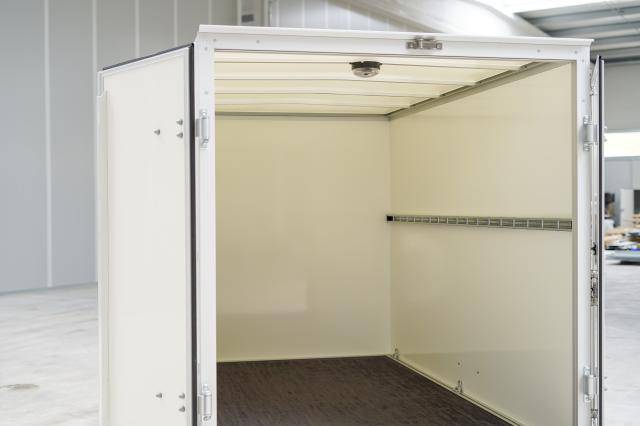 - Wände aus selbst produzierten, gewichtsoptimierten Unique Panels für deutliche Nutzlaststeigerung, bestehend aus GFK-Stahl-Sandwich in Verkehrsweiß (RAL 9016)