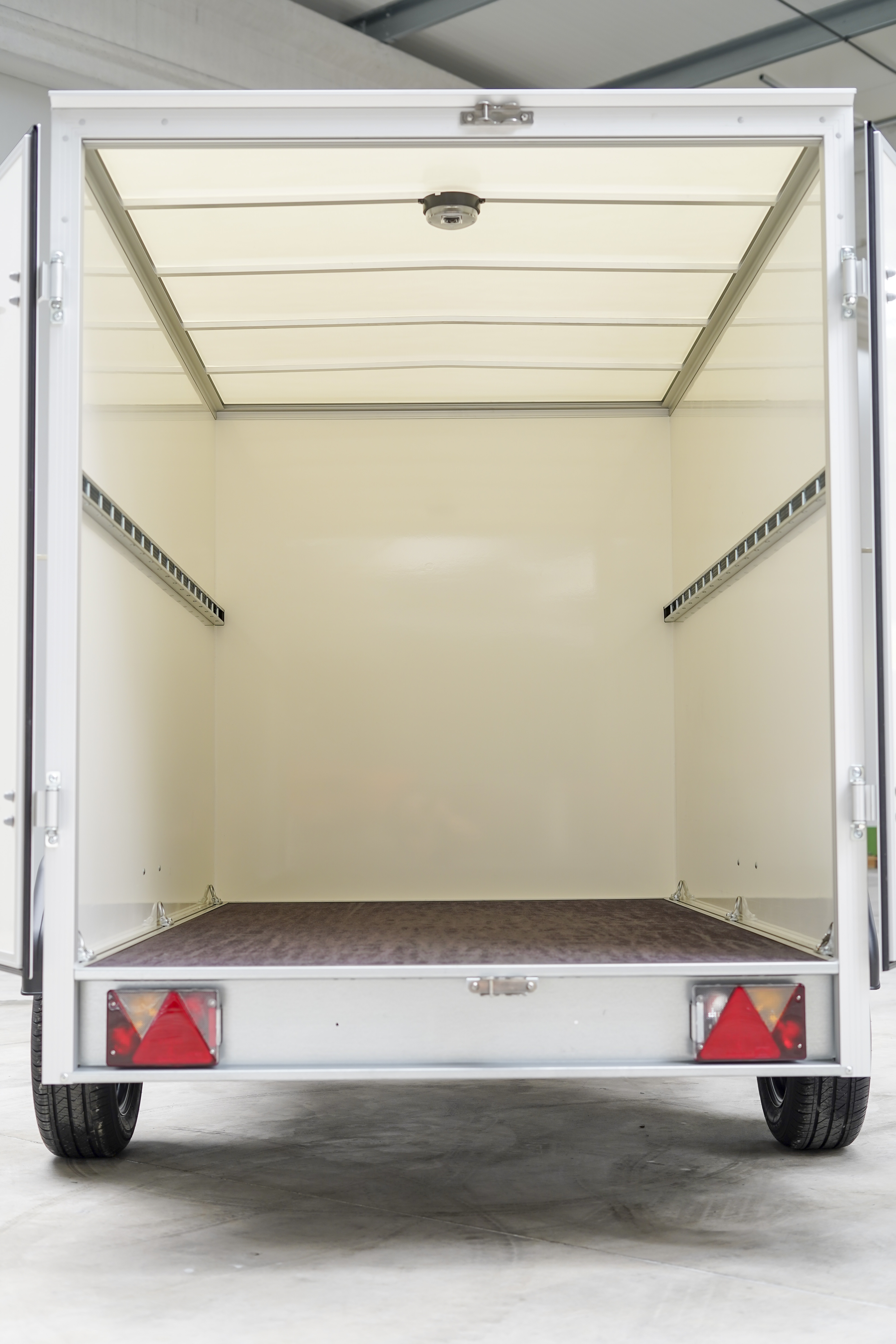 - Wände aus selbst produzierten, gewichtsoptimierten Unique Panels für deutliche Nutzlaststeigerung, bestehend aus GFK-Stahl-Sandwich in Verkehrsweiß (RAL 9016)