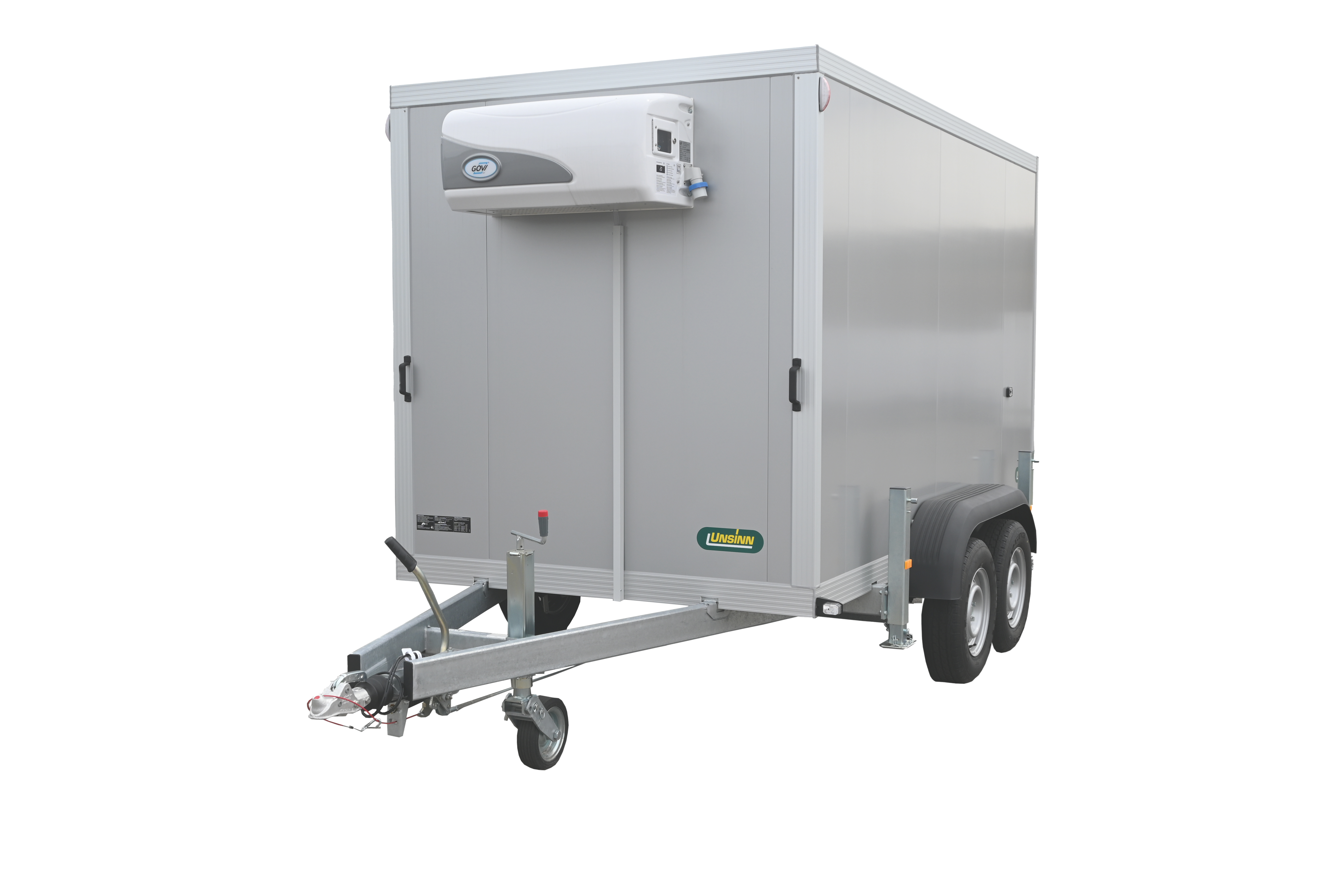 13634Kälteaggregat auf Zugdeichsel montiert: Kälteleistung 2550 Watt bei einer Kühlraumtemperatur von 0°C und einer Umgebungs- temperatur von 30°C, Temperaturregelbereich von -2°C bis +15°C, Netzanschluss 230 Volt 50 Hz, inkl. 230 Volt Innenbeleuchtung stirnseitig am Verdampfer montiert, Luftvolumenstrom Verdampfer 1130 m³/Std., mit verstärktem Hauptschütz |