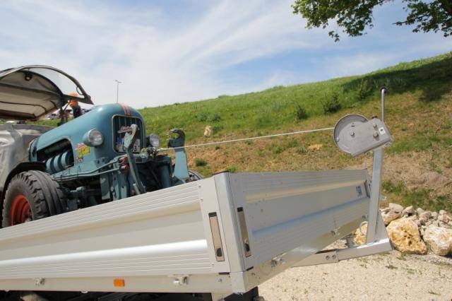 - Massive, 850 mm hohe Stahlgitterauffahrrampe geschlossen mit Alu-Riffelblech und Gasfederunterstützung über die gesamte Anhängerbreite für einfaches Öffnen & Schließen, Auffahrwinkel: 13° | Kippwinkel seitlich: 48°