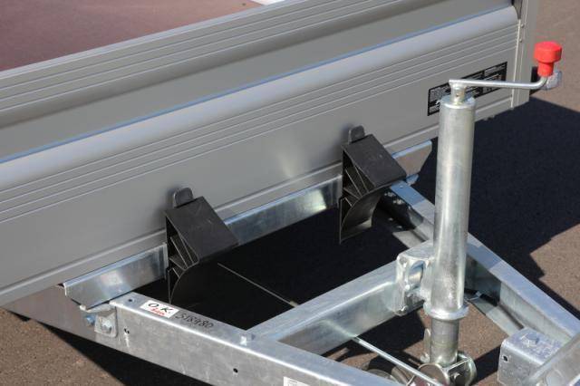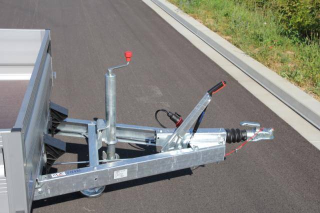 - Verstärktes, an einer separaten Quertraverse montiertes Automatikstützrad mit einer Tragkraft von 500 kg für sicheres Abstellen des Anhängers