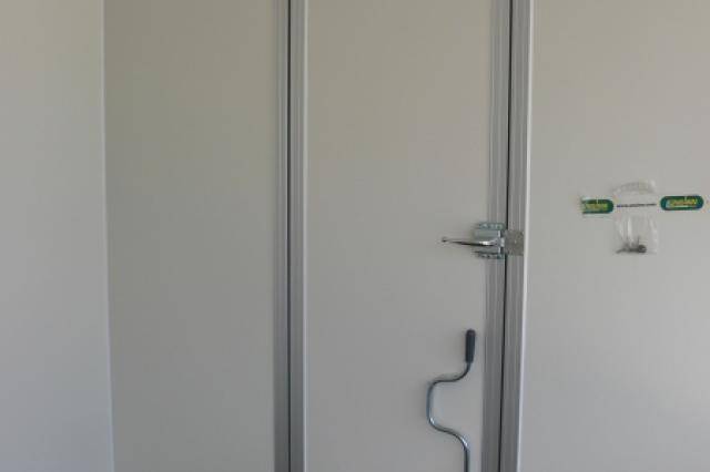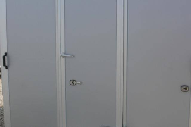 - Mittig in der Stirnwand eingebaute Eingangstür (2000 x 650 mm) mit aufgesetzter Türklinke