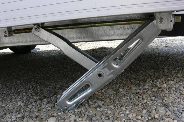 - Verstärktes, an einer separaten Quertraverse montiertes Automatikstützrad mit einer Tragkraft von 500 kg für sicheres Abstellen des Anhängers