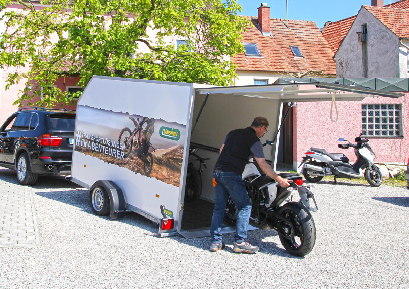 Anhänger gesenkt, Vorteile erhöht! Mit den Absenkanhänger mit Kofferaufbau Typ UKA verbinden wir die Vorteile eines gewöhnlichen Kofferanhängers mit der in vielerlei Hinsicht nützlichen Funktion des Absenkens. Durch das Absenken können z.B. Fahrzeuge wie Motorräder oder Paletten mit dem Hubwagen mühelos eingefahren werden.