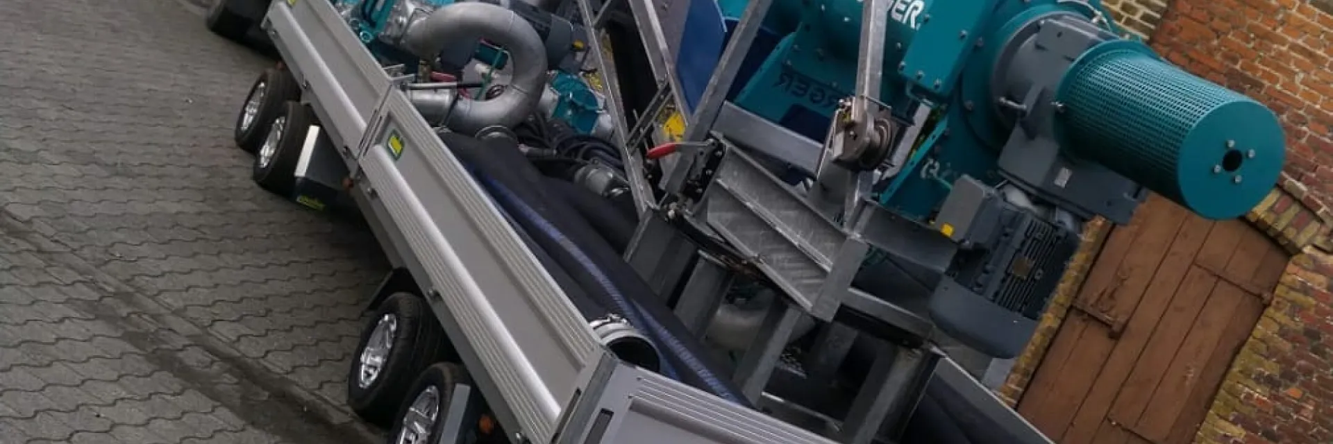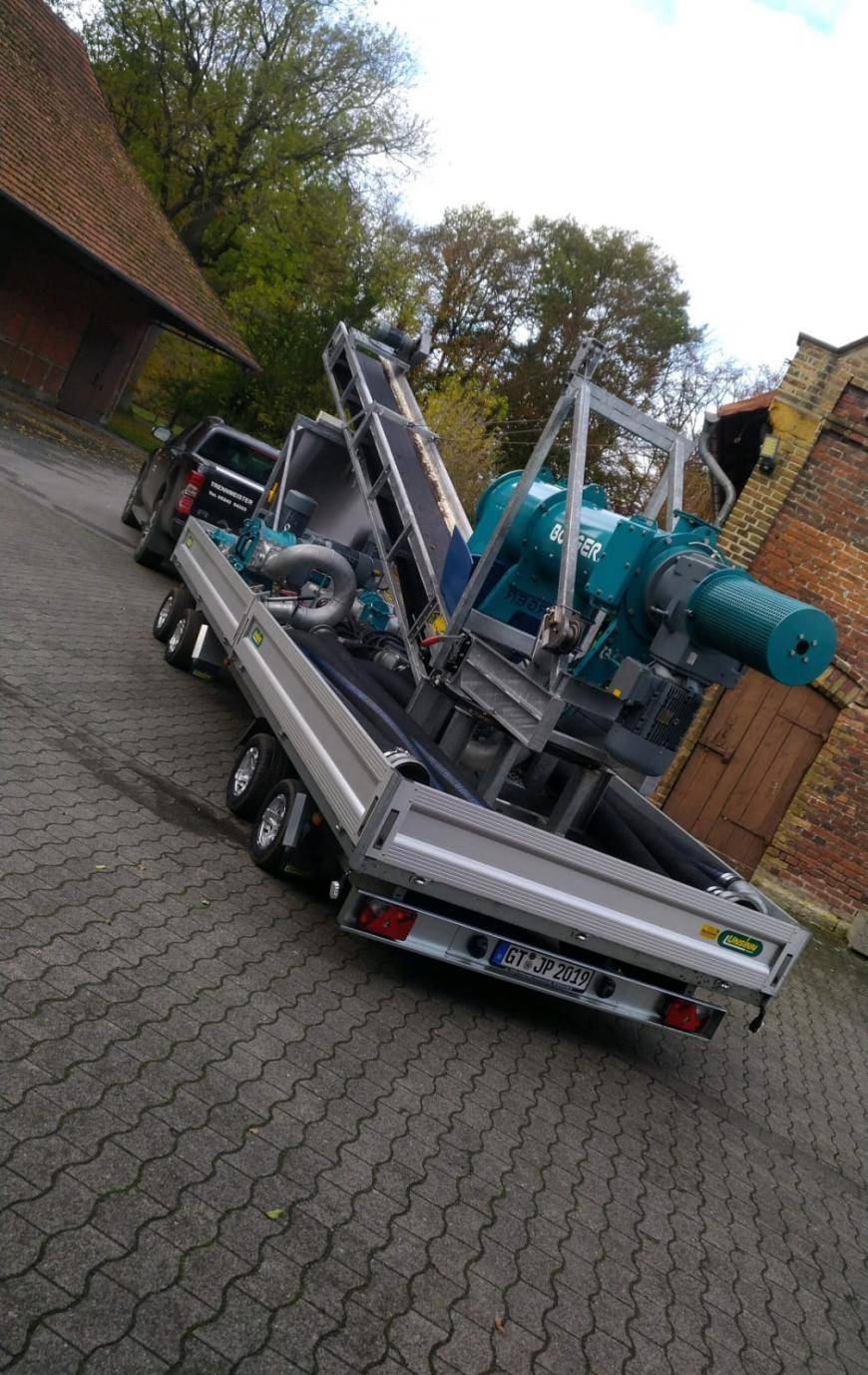 Der mobile Gülle-Separator der Firma Agro-System, mit dem die feste und flüssige Phase in Biogas-Anlagen getrennt wird, ist als komplette Einheit auf einem 4-achsigen UNSINN-Anhänger verbaut und sofort einsatzbereit.