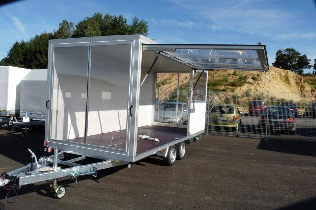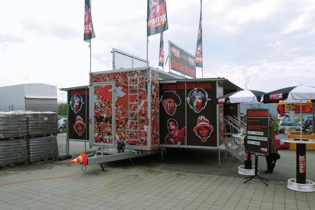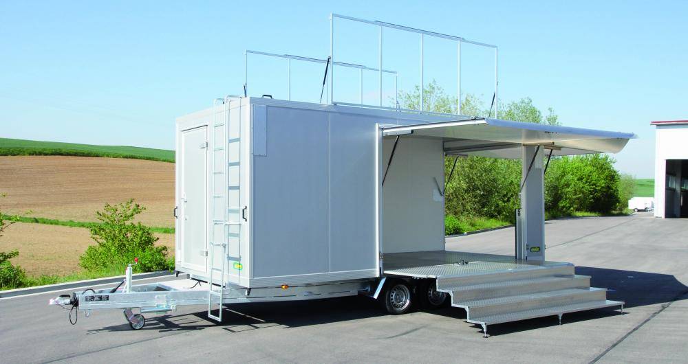 Immer alles dabei! Klappe auf, die Bühne aufgeklappt und der Verkauf kann losgehen! Nach Ihren Wünschen wird der Anhänger mit Fahnen, Planen, Fernsehern und sonstigen Verkaufsutensilien bestückt!