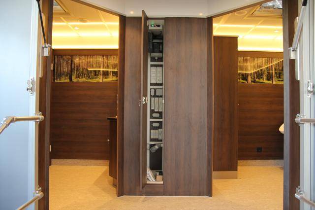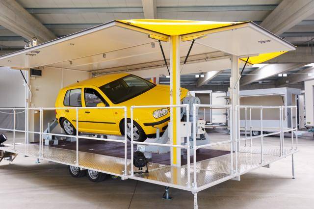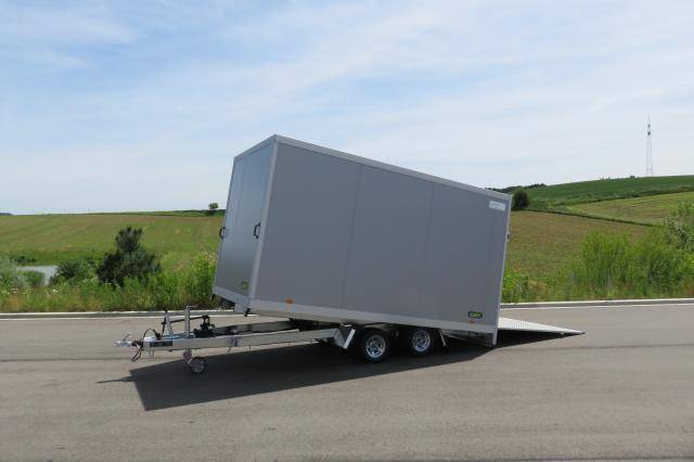 Der Kofferanhänger mit zwei Ebenen wird als Büro und als Stauraum für die benötigten Utensilien eines Motorsportrennens genutzt. Der Anhänger dient als Rennanalysezentrum bei allen Rennen und ist auch gleichzeitig der Boxenstop für das Rennauto.
