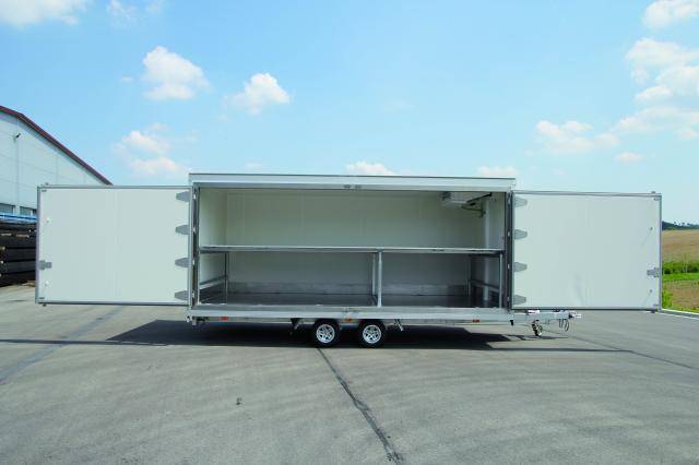 Ein nach Kundenwunsch angefertiger Kofferanhänger mit der Möglichkeit mehrere Särge gleichzeitig unter der vorgeschriebenen Temperatur zu transportieren. Hier hat der Anhänger einen eingebauten Zwischenboden.