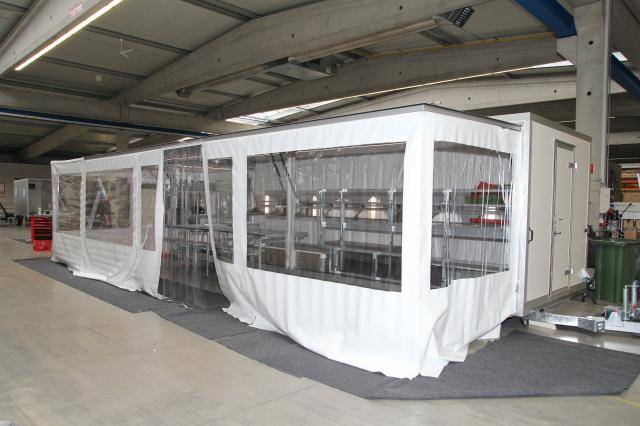 Speziell nach den Vorstellungen vom Kunden angefertiger Aufbau mit Planenfenstern.