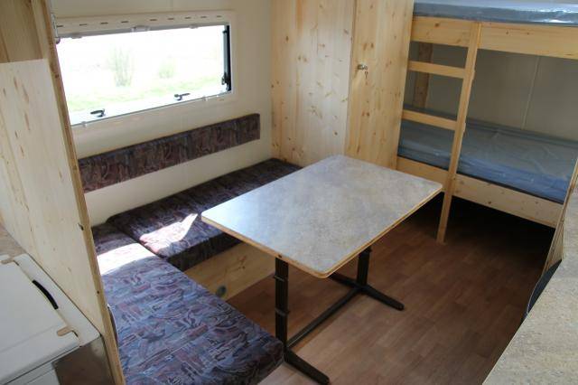 Ein Baustellenanhänger kann innen ganz individuell gestaltet werden, ob mit Sitzmöglichkeiten, Schlafplätzen oder einem Arbeitsplatz. Dieser Anhänger bietet die Möglichkeit zu einer leckeren Brotzeit mit Sitzecke und einem Tisch mit eingebauter Heizung.