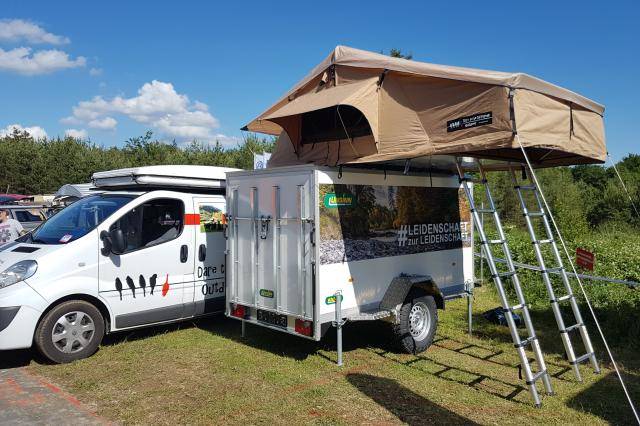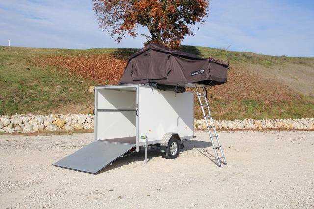 Im Anhänger das komplette Equipment witterungs. und sichtgeschützt transportieren, oben im robusten Zelt gemütlich mit Matratze im Freien übernachten. Das Dachzelt ist schnell auf- und abgebaut.
