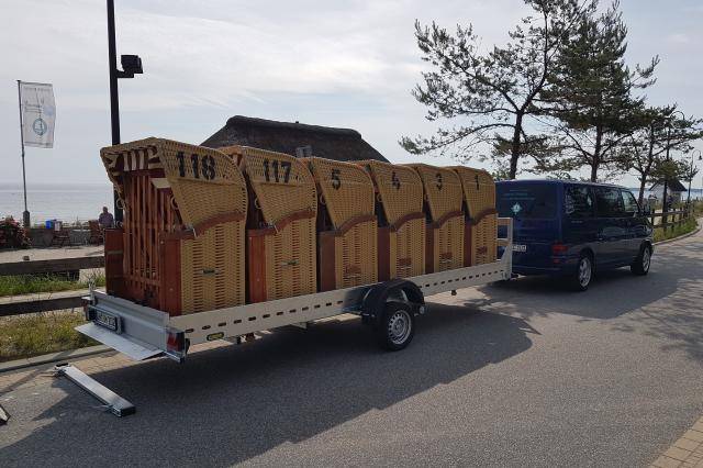 Ein langer Absenkanhänger für den Transport von mehreren Strandkörben zum einfachen Verteilen am Strand an die Besucher der Ostsee. Mit wenigen Handgriffen kann der Strandkorb an der richtigen Position abgestellt werden.