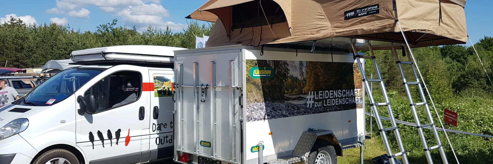 Im Anhänger das komplette Equipment witterungs. und sichtgeschützt transportieren, oben im robusten Zelt gemütlich mit Matratze im Freien übernachten. Das Dachzelt ist schnell auf- und abgebaut.
