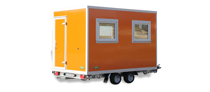 Ein komplett ausgebauter Wohnanhänger mit mehreren Schlafplätzen, kleiner Küche und Sitzmöglichkeiten. Solch ein Anhänger kann bei Montagearbeiten flexibel eingesetzt werden für z. B. das Aufbaupersonal.