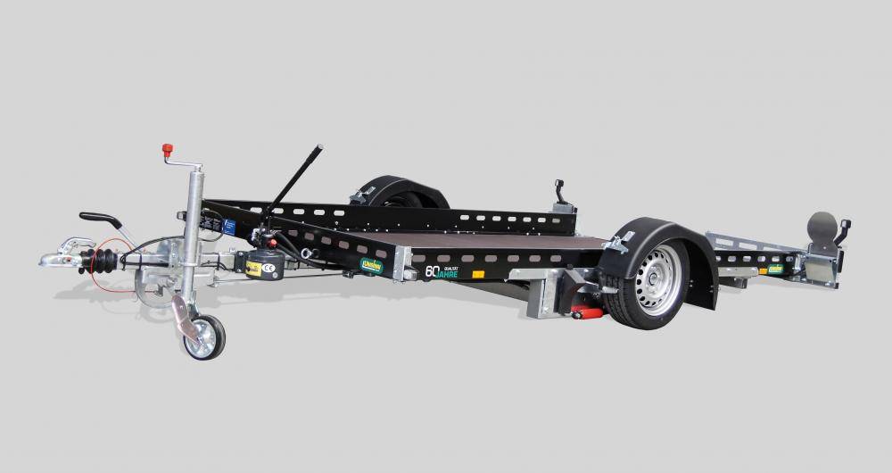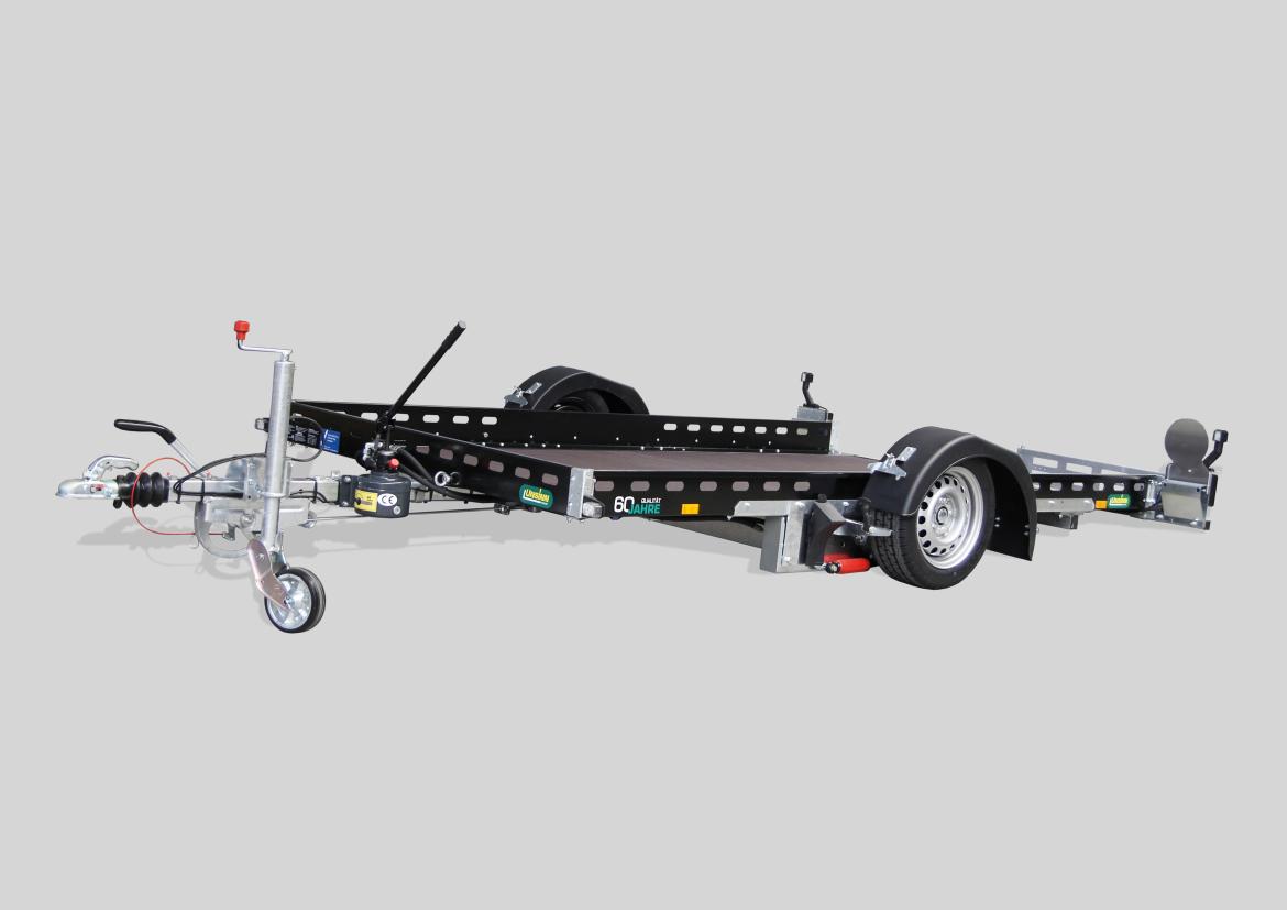 Als letzten 60 Jahre - Editionsanhänger präsentieren wir unseren Autotransporter Typ AHK 3043-10-2070 mit schwarzen Seitenschürzen, durchgehendem Aluboden, Universalschienenverstellung und 100 km/h Ausführung.