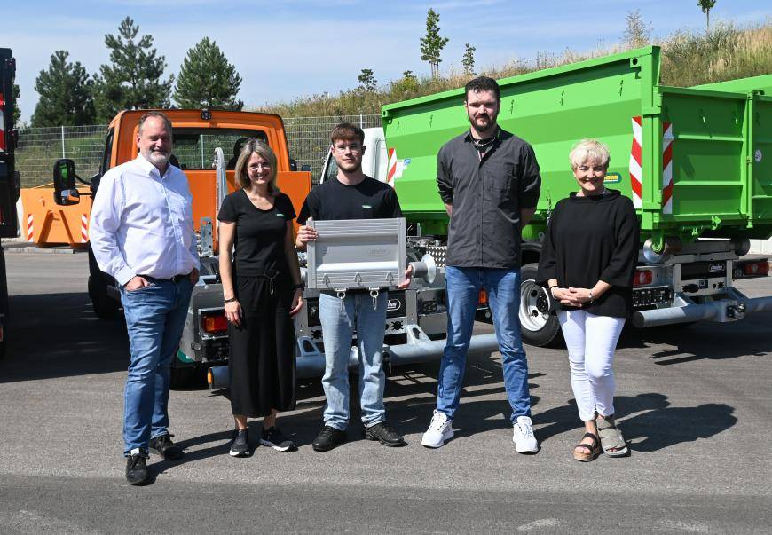 Im Bild (v.l.n.r.): Geschäftsführer Gunnar Bregler, Ausbildungsleiterin Juliane Noppinger, Techn. Produktdesigner Fabian Matt, Ausbilder Johannes Schmid & Geschäftsführerin Rosa Unsinn